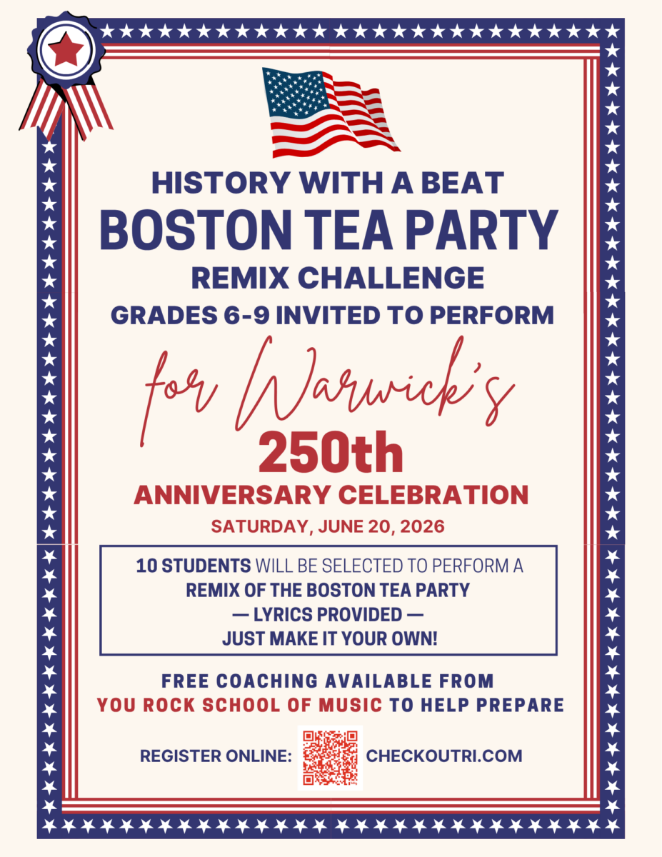Ten students in grades 6–9 will be selected to perform the lyrics of the Boston Tea Party at the City of Warwick’s 250th Celebration at Rocky Point on Saturday, June 20, 2026.